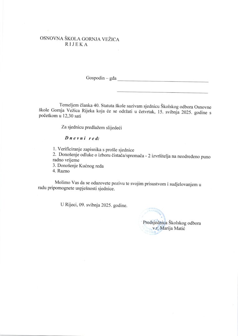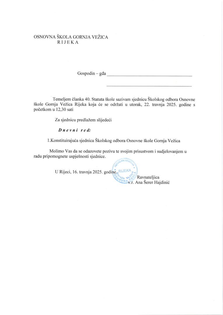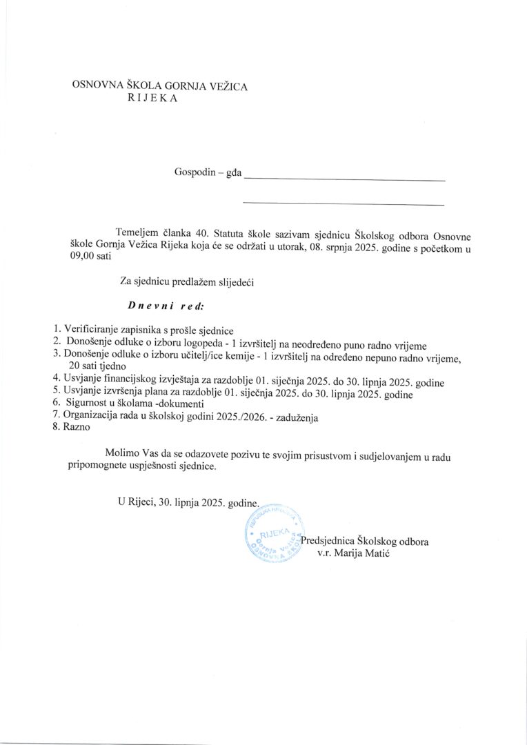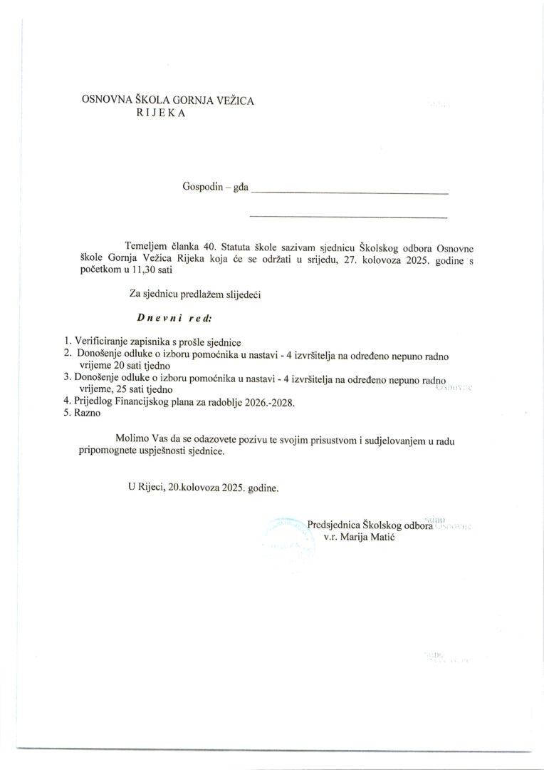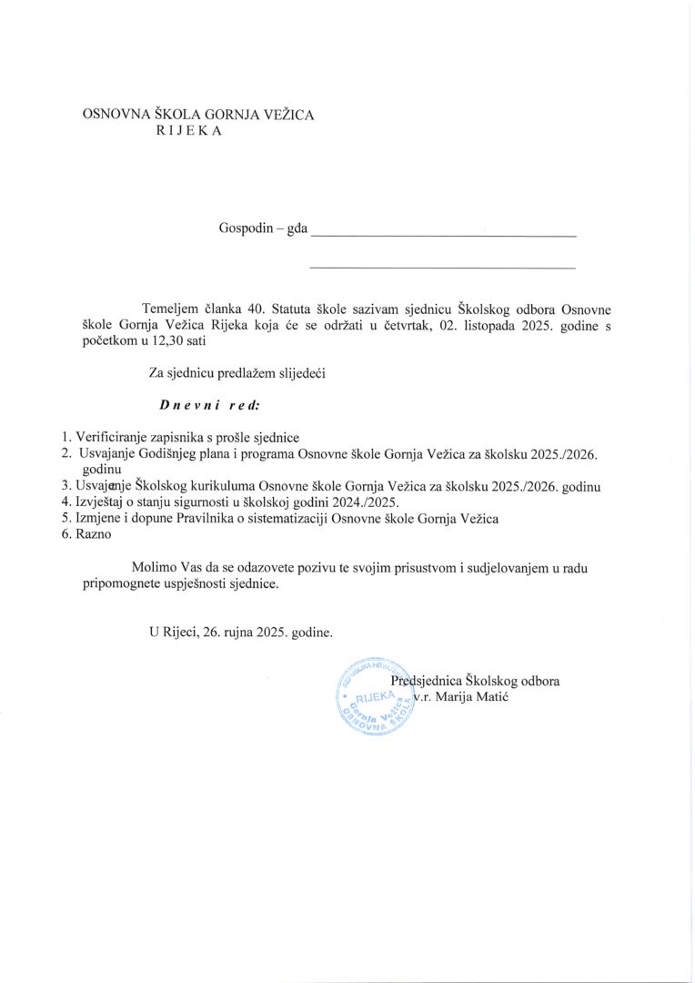 Školski odbor Članovi Školskog odbora 1. Marija Matić, OŠ Gornja Vežica, predsjednica 2. Karin Felker, OŠ Gornja Vežica 3. Tatjana Bićanić, OŠ Gornja Vežica 4. Branka Žgaljić, predstavnica Vijeća roditelja OŠ Gornja Vežica Poziv na sjednicu Školskog odbora Poziv na sjednicu Školskog odbora Poziv na sjednicu Školskog odbora Poziv na sjednicu Školskog odbora Poziv na sjednicu Školskog odbora